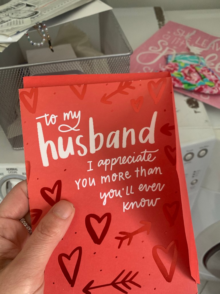 As I was cleaning out our mail/paper storage area in the laundry room, I came across a card. It was a card that I had gotten Eddie for Valentines Day this past year. I had put it there because I didn’t give it to him. I was too busy and forgot to write it out this year. Then I figured I’d just save it for next year. If only I knew. There would be no next year with him. No more celebrations. No more him.